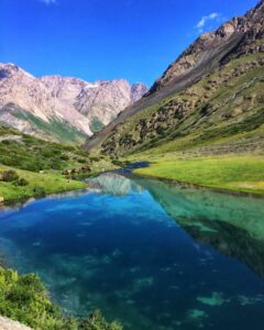 In the morning, we set off on horseback towards the Kara Takya Valley. The route passes by a lake located at an altitude of 3,200 m.